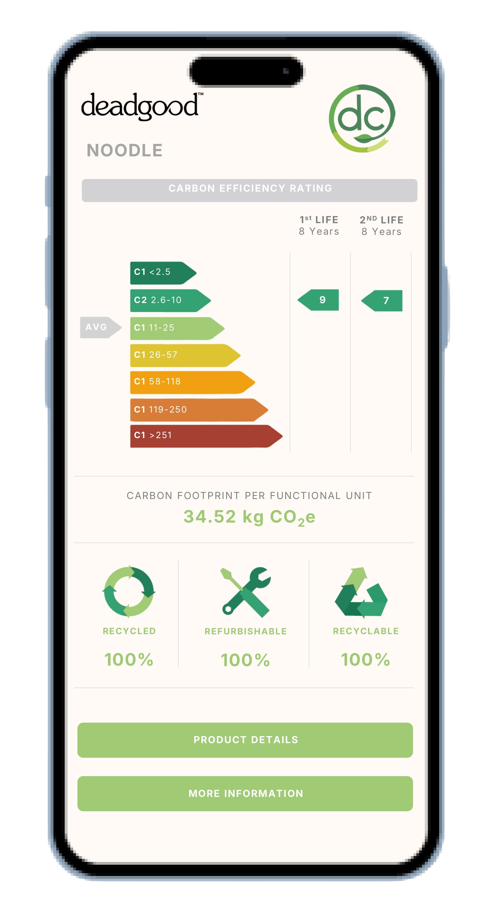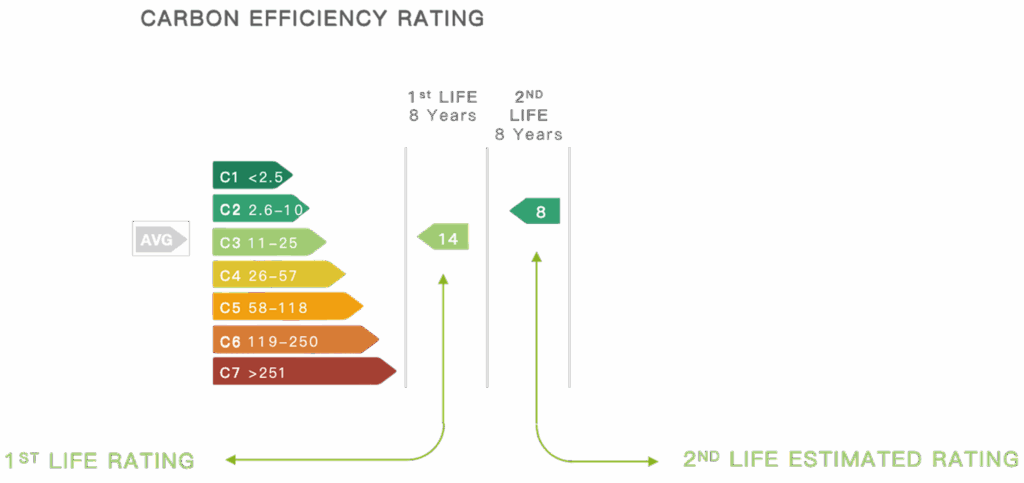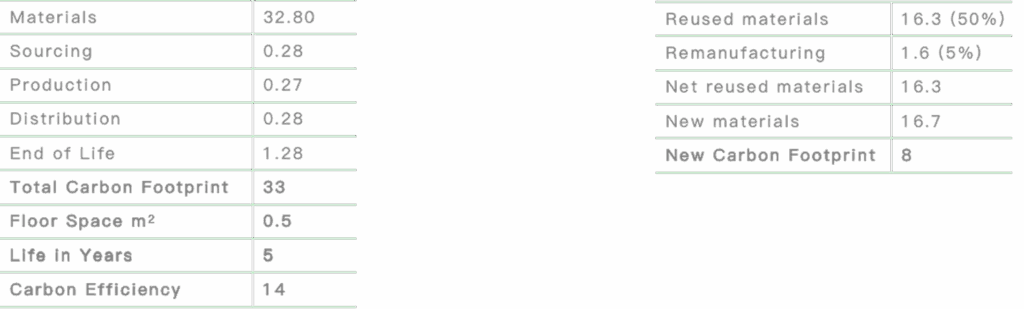 Carbon Efficiency: A simplified reporting method that measures the whole life carbon footprint, against life and floor space, as a measured rating. It allows us to measure and score the 1st life of the product, estimate the 2nd life score and also indicate the average score by product type. ISO59004 defines ‘reuseʼ as; ‘use of a product or its component parts after their initial use, for the same purpose for which they were originally designedʼ. We determine ‘2nd lifeʼ as a form of reuse, encompassing reuse, repair or remanufacture.