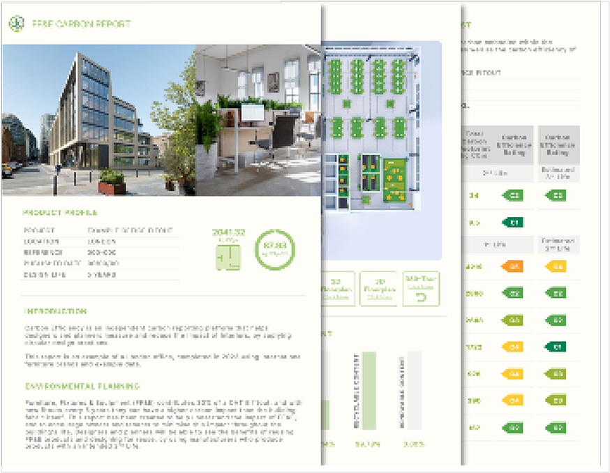 Our FF&E interior fit-out reports allow architects, interiors designers, specifiers and facilities management companies to report the carbon impact of interiors. More then this, our reports support Carbon Reduction Planning by clearly highlighting the benefits of reuse as a way to reduce the carbon impact of interiors.
