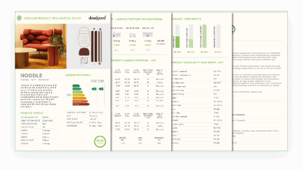 We’ve teamed up with Terra Matters in Luxemburg to offer their Product Circular Data Sheets (PCDS), as either part of our Silver and Gold Furniture Passports, or separately. PCDS’ are ISO 59040 and provide an extensive set of data points for circular evaluation and certification. Terra Matters are working with the EU Commission on Digital Product Passports, and these are a key stepping stone to future compliance.
